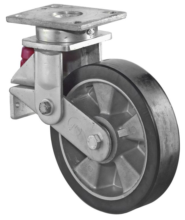 Gefederte Schwerlastrolle T100.B91.125, Produkttyp: Lenkrollen gefedert, Befestigung: Anschraubplatte, Ø Schraubloch: 10 mm, Material/Art des Radkörpers: Aluminium, Material der Lauffläche: Guss-Polyurethan 78 Shore A, Lager: Kugellager, Ø Rad: 125 mm, T
