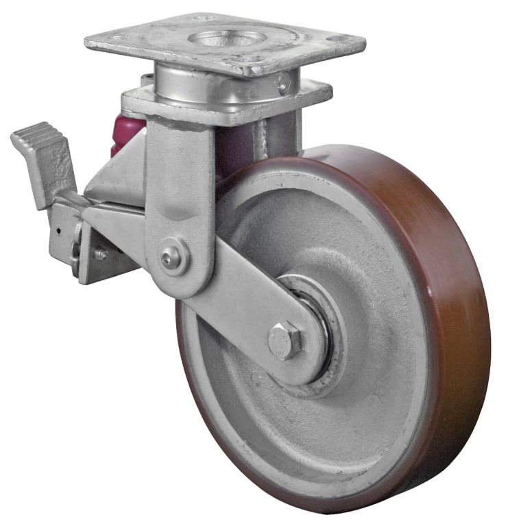 Gefederte Schwerlastrolle T120.C10.200, Produkttyp: Lenkrollen mit Feststeller gefedert, Befestigung: Anschraubplatte, Ø Schraubloch: 10 mm, Material/Art des Radkörpers: Guss, Material der Lauffläche: Prothane® Guss-Polyurethan 95 +/-3 Shore A, Lager: Kug