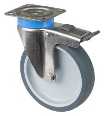 Edelstahl Apparaterolle G120.A80.126, Produkttyp: Lenkrollen mit Feststeller, Befestigung: Anschraubplatte, Ø Schraubloch: 8.3 mm, Material/Art des Radkörpers: Kunststoff, Material der Lauffläche: thermoplastischer Gummi grau, Lager: Gleitlager, Ø Rad: 1