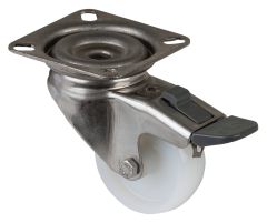 Edelstahl Apparaterolle G120.A90.051, Produkttyp: Lenkrollen mit Feststeller, Befestigung: Anschraubplatte, Ø Schraubloch: 6.5 mm, Material/Art des Radkörpers: Kunststoff, Material der Lauffläche: Kunststoff, Lager: Gleitlager, Ø Rad:  50 mm, Tragkraft: 5