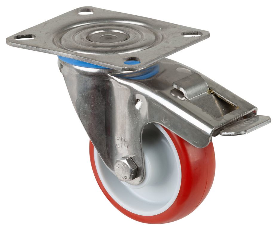 Edelstahl Transportrolle H120.B26.080, Produkttyp: Lenkrollen mit Feststeller, Befestigung: Anschraubplatte, Ø Schraubloch: 9 mm, Material/Art des Radkörpers: Kunststoff, Material der Lauffläche: Polyurethan rot 98 +/-4 Shore A, Lager: Gleitlager, Ø Rad: