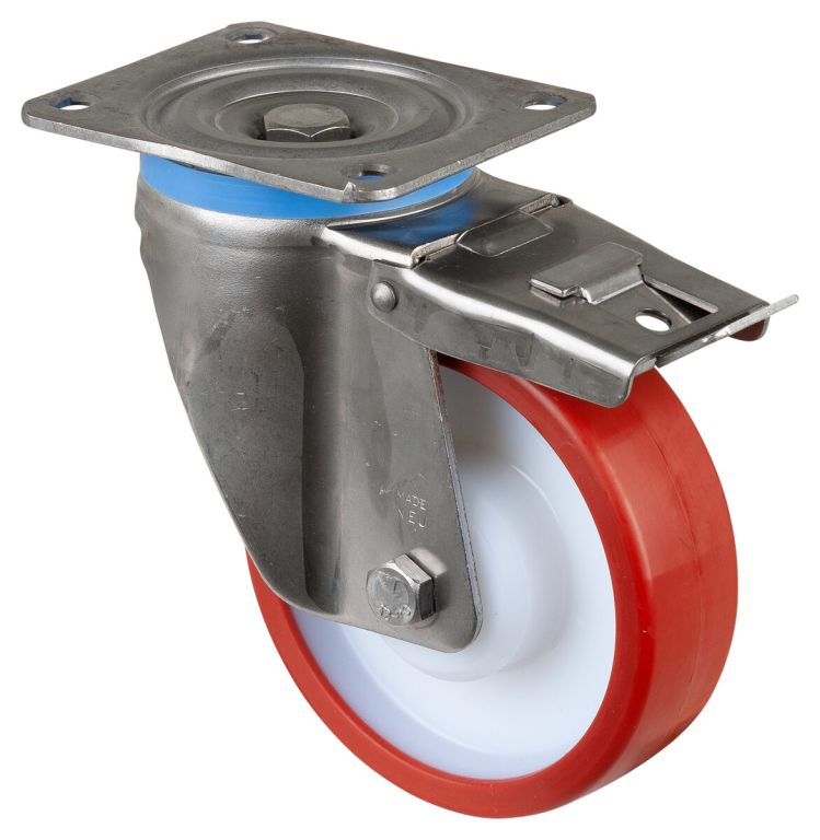 Edelstahl Schwerlastrollen HS120.B27.150, Produkttyp: Lenkrollen mit Totalfeststeller, Befestigung: Anschraubplatte, Ø Schraubloch: 12 mm, Material/Art des Radkörpers: Kunststoff, Material der Lauffläche: Polyurethan rot 98 +/-4 Shore A, Lager: Gleitlager