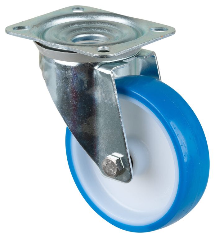 Transportrolle L400.B36.150, Produkttyp: Lenkrollen, Befestigung: Anschraubplatte, Ø Schraubloch: 11 mm, Material/Art des Radkörpers: Kunststoff, Material der Lauffläche: Polyurethan blau 85 +/-4 Shore A, Lager: Rollenlager, Ø Rad:  150 mm, Tragkraft: 200