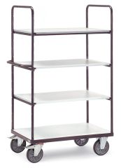 Elektrisch leitfähige Ausführung. Stahlrohr und Profilstahl geschweißt, elektrisch leitfähig pulverbeschichtet, schiefergrau RAL 7015. Schraub- und Steckkonstruktion. 1 fester und 3 lose Böden aus elektrisch leitfähiger Holzwerkstoffplatte nach DIN 68765, hellgrau. 2 Lenk- und 2 Bockrollen, Räder mit TPE-ESD-Bereifung (thermoplastisches Elastomer), elektrisch leitfähig. Naben mit Präzisions-Rillenkugellager. Höchster Komfort: Sehr geringer Anfahr-, Roll- und Schwenkwiderstand. Geräuscharmer Lauf auf ebenen Böden. Reifen nicht kreidend (spurlos). Feststeller an den Lenkrollen, gemäß der Europäischen Norm EN 1757-3 (Sicherheit von Plattformwagen). Tragkraft pro Einlegeboden 50 kg.